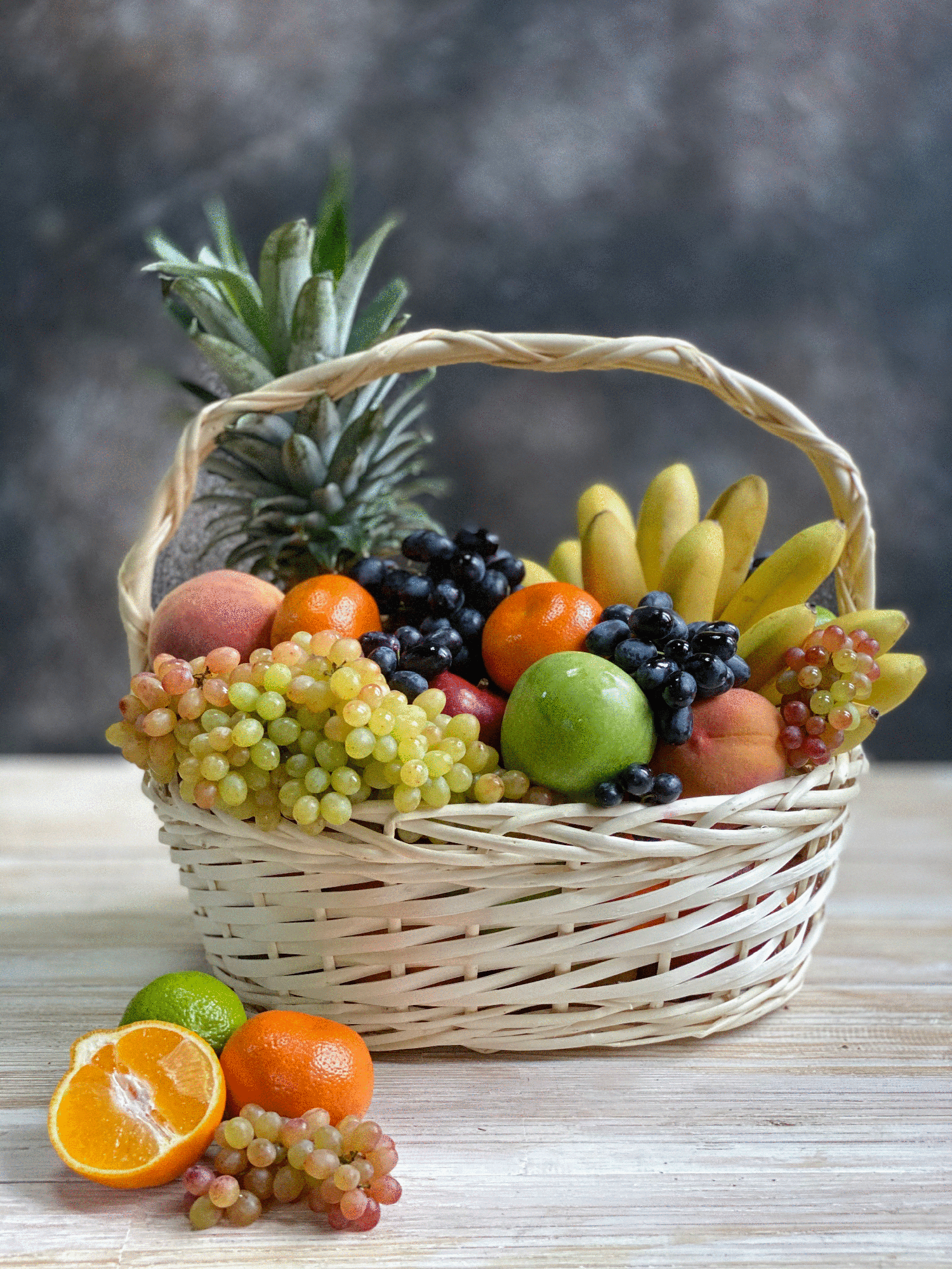 Корзина большая, ананас голд, мини бананы, мандарины, апельсины, яблоки, груши, персики, киви, лайм, 2 вида винограда. 7 кг.