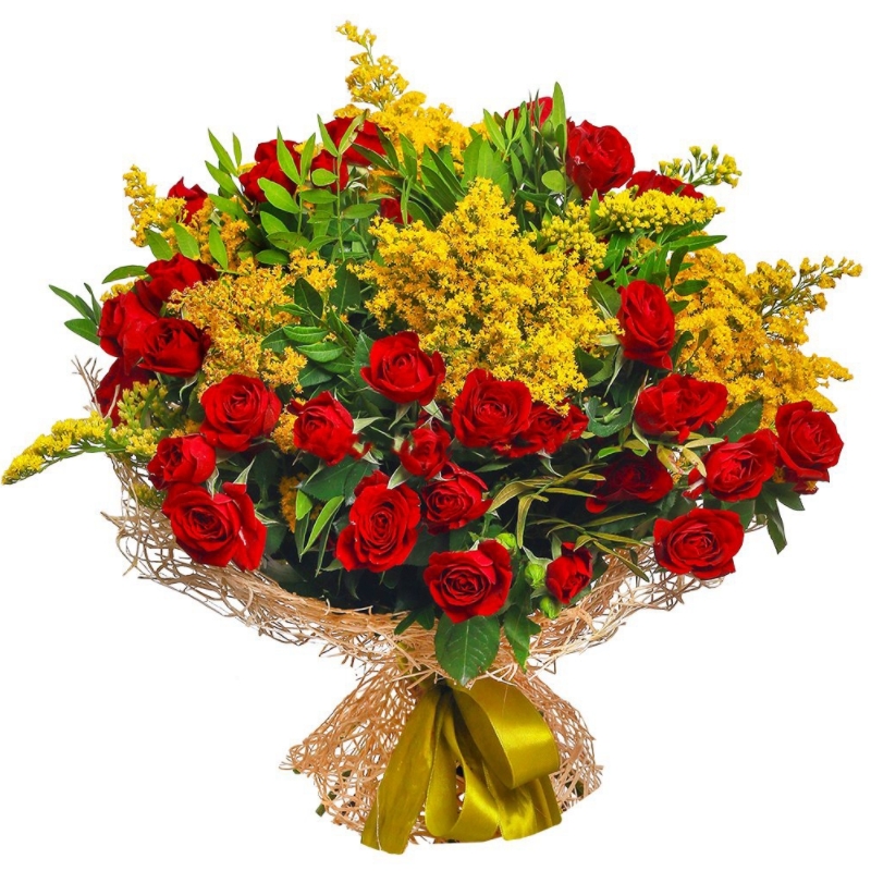 Букет состоит из 9 кустовых роз, 8 веток мимозы, зелень, красивая упаковка, атласная лента.